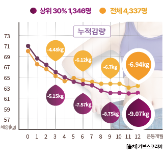 실제 커브스 회원 4,337명 인바디 데이터 추적 결과 커브스 30분 순환운동의 체중 감량 효과를 확인해보세요.