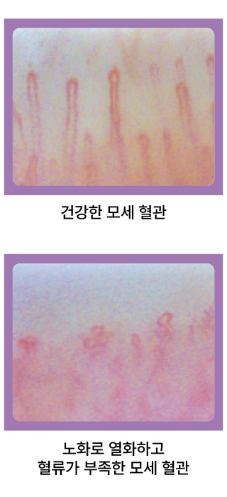 모세혈관은 보통 45세부터 줄어들기 시작해 60대에는 40%나 감소합니다. 모세혈관의 감소는 피부 노화로도 연결되어 기미, 주름, 처짐, 탈모 등의 원인이 되는 것입니다.